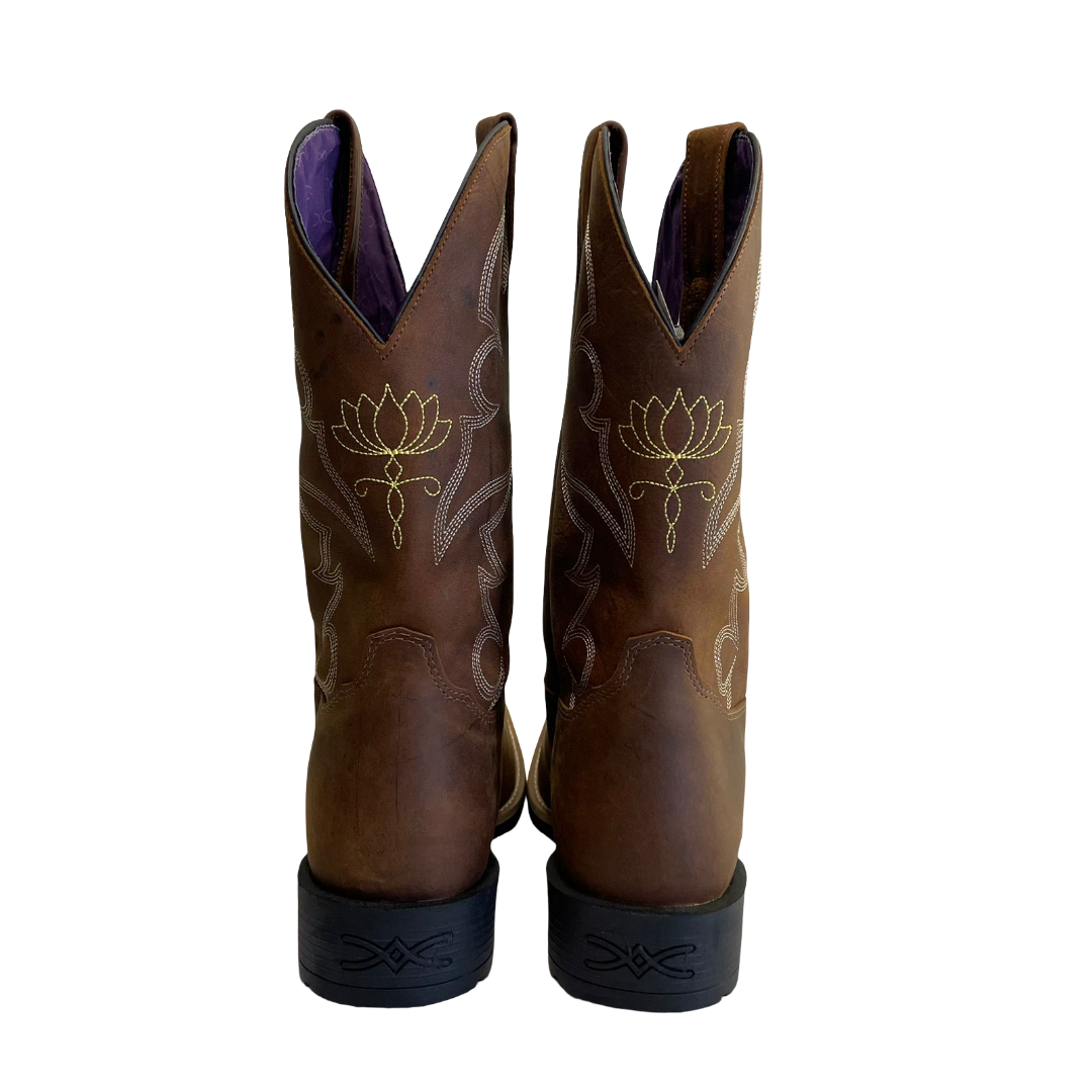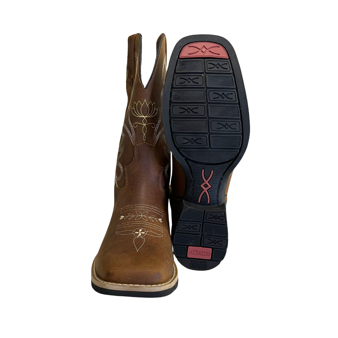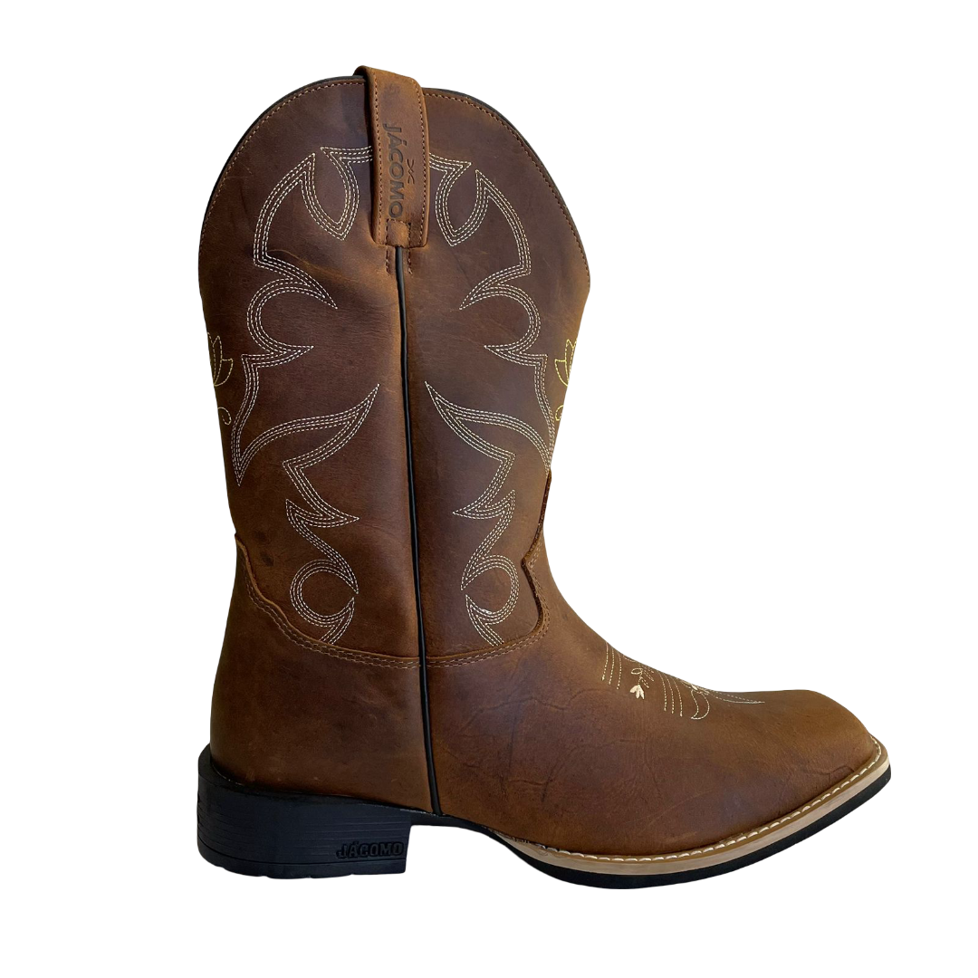 O bico quadrado é um detalhe que remete à tradição do oeste, adicionando um toque artístico e único à bota;