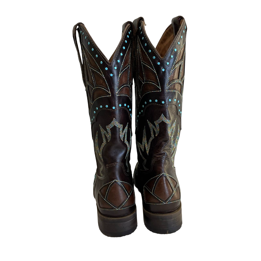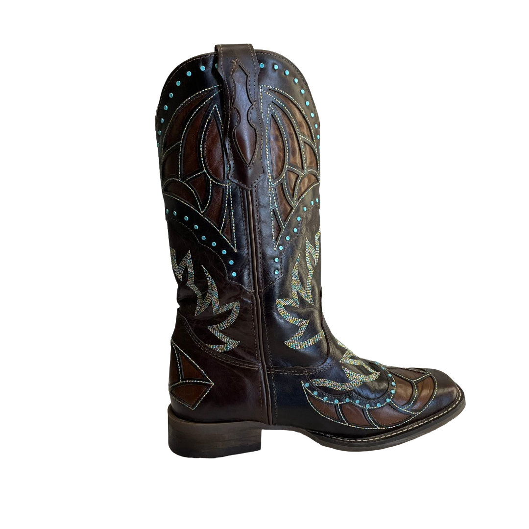 O bico quadrado com floral bordado no peito do pé é um detalhe que remete à tradição do oeste, adicionando um toque artístico e único à bota
