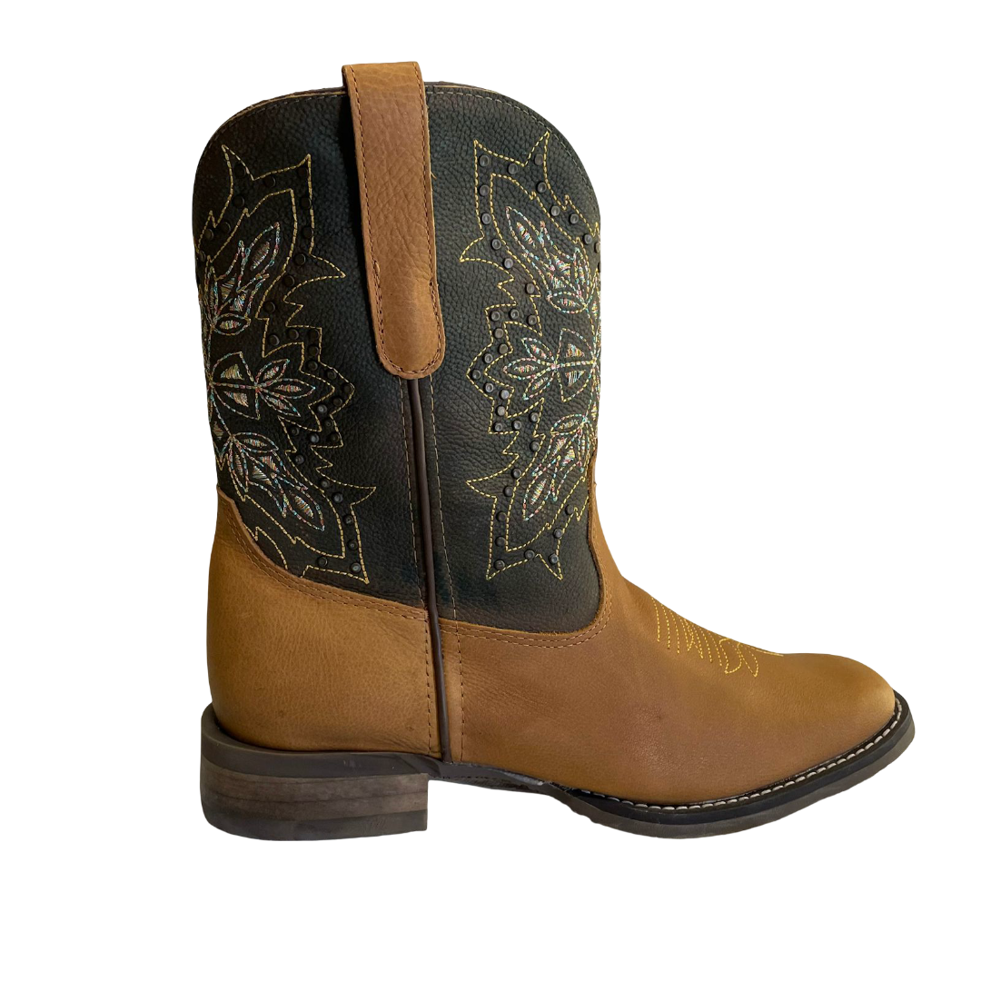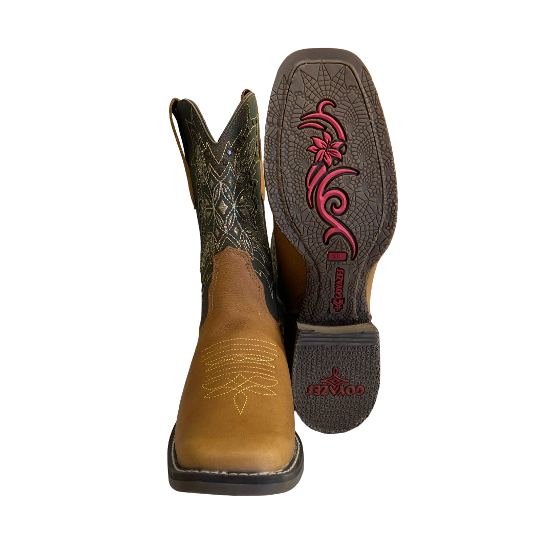 O bico quadrado é um detalhe que remete à tradição do oeste, adicionando um toque artístico e único à bota;
