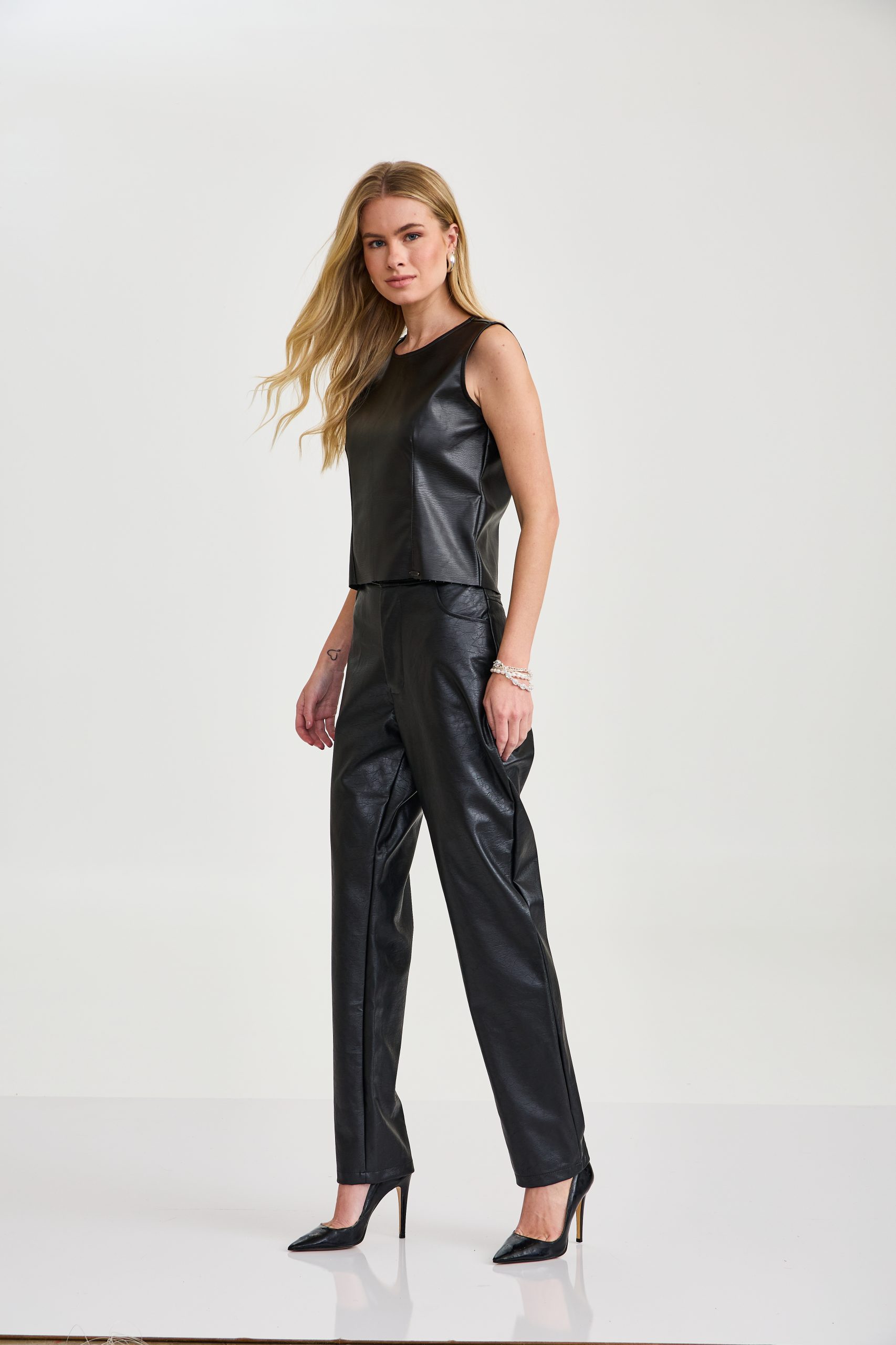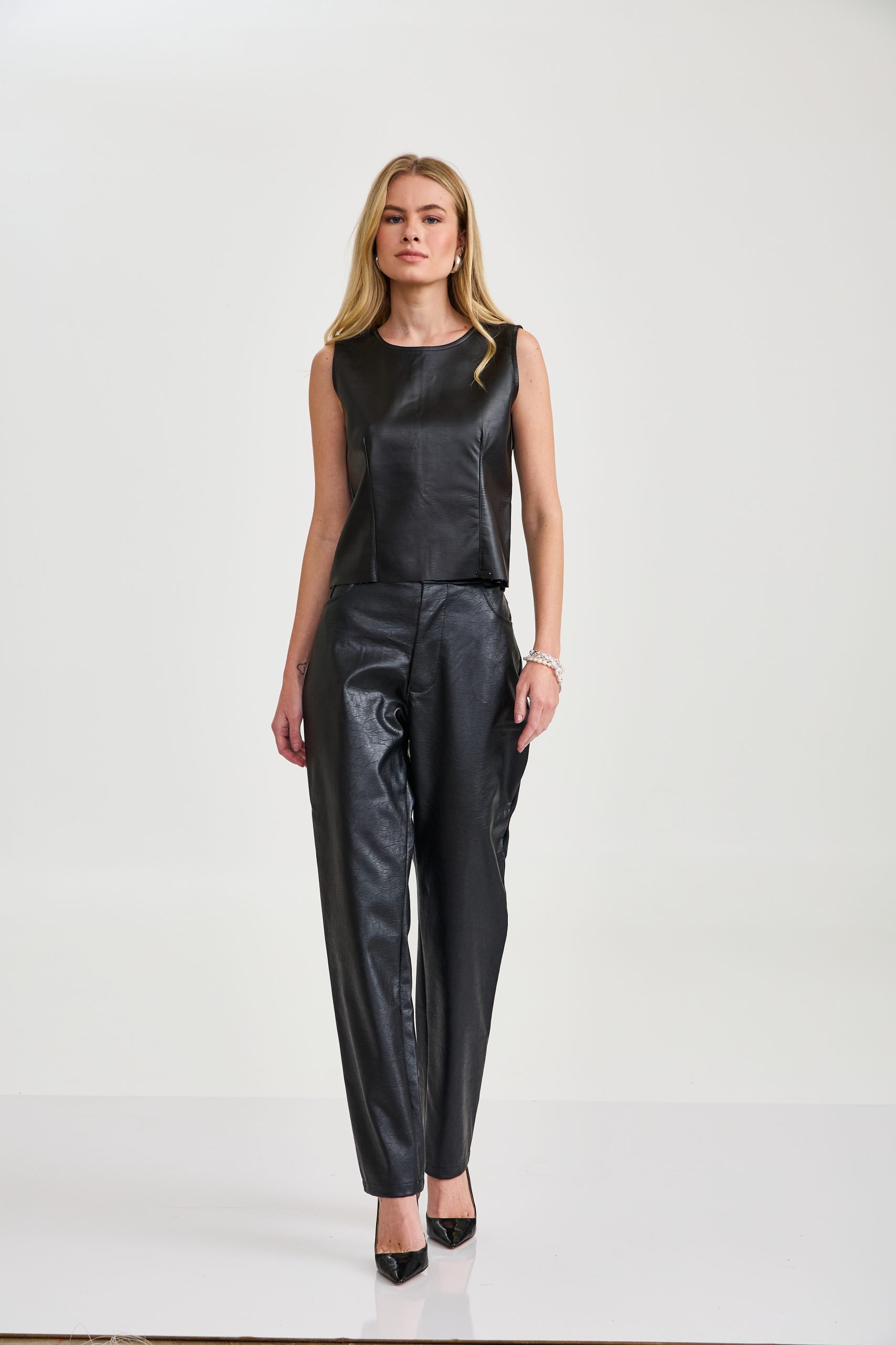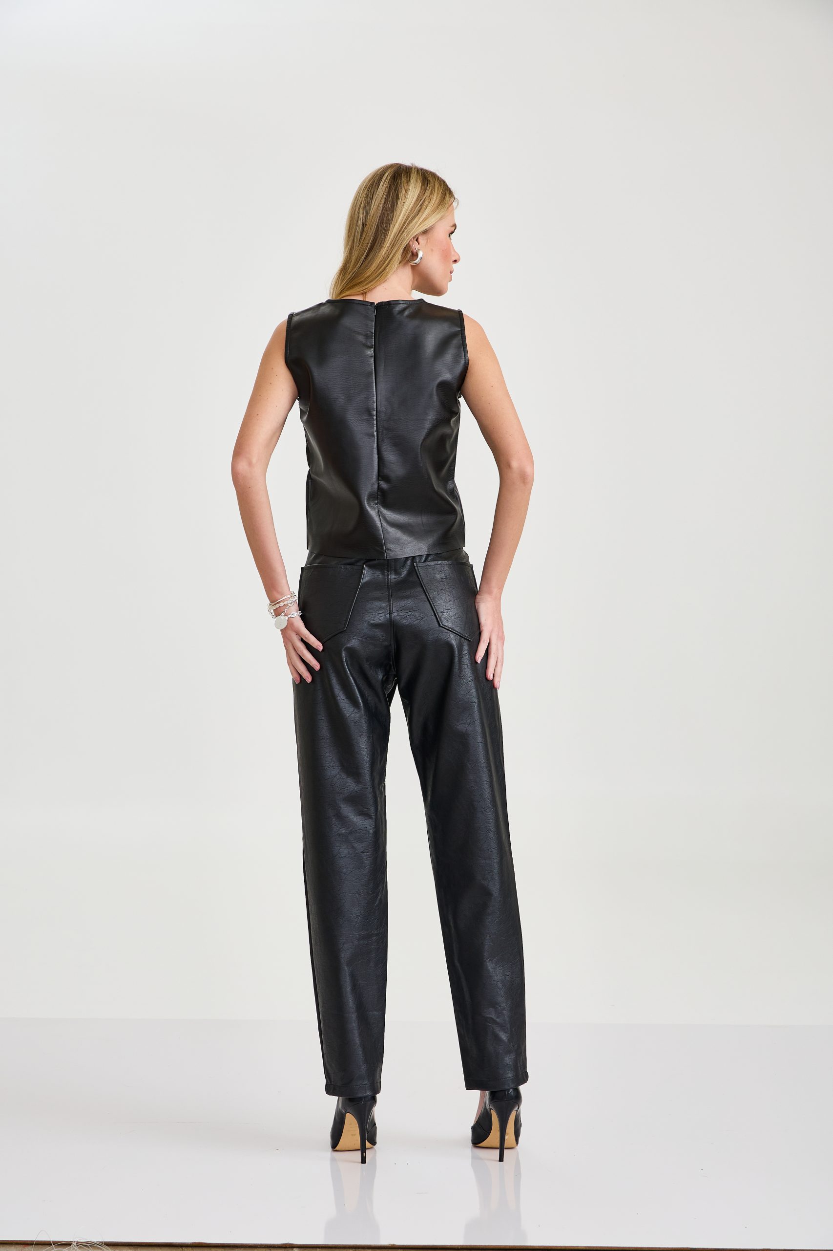 Regata feminina em material sintético estilo couro, na cor preta, com design minimalista e moderno. Possui gola alta arredondada, modelagem reta e caimento estruturado que valoriza a silhueta. Peça versátil e elegante, perfeita para composições sofisticadas, podendo ser usada tanto em produções casuais quanto em looks mais elaborados.